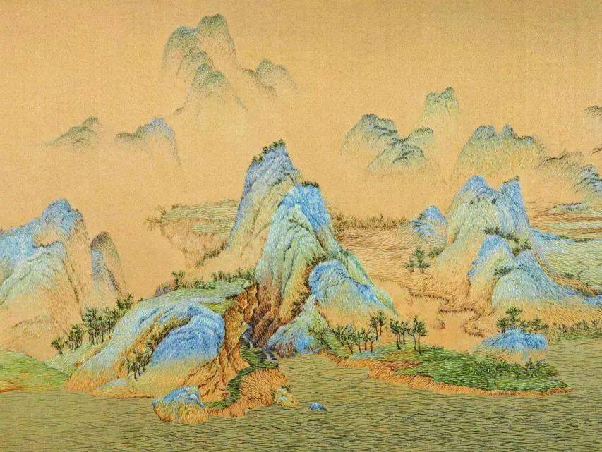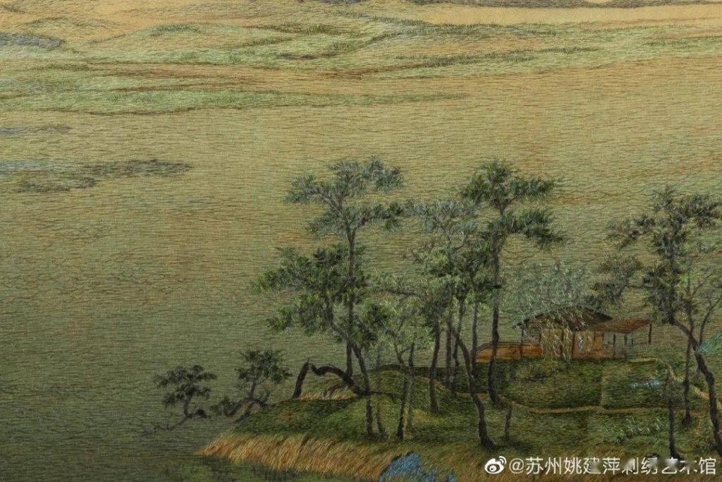 In this work, the green-and-blue landscape is rendered with ancient, elegant colors. The transitions of light and shadow are subtle yet profound. To faithfully capture the charm of the original painting, she used countless short, fine, and varied stitches, applying a special “pressing-light” method during embroidery to achieve the delicate shading and texture of the original masterpiece.