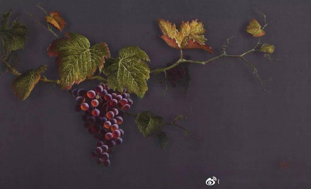 In her embroidery of translucent grapes, the fruit seems ready to burst with juice.
