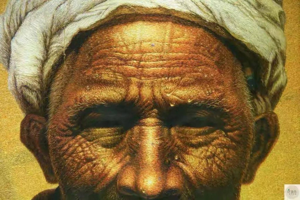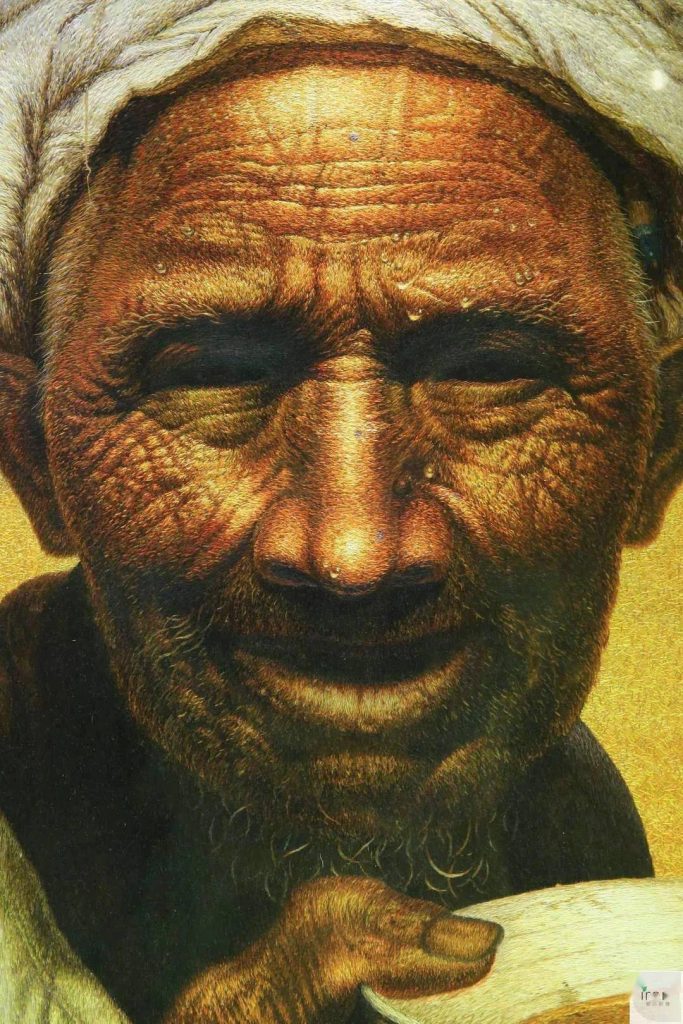 The beads of sweat glistening on the man’s forehead seem as if they might slide down at any moment. To capture the weathered look of a lifetime of hardship, the artist used a variety of needle techniques, switching between different thicknesses and directions of stitches.