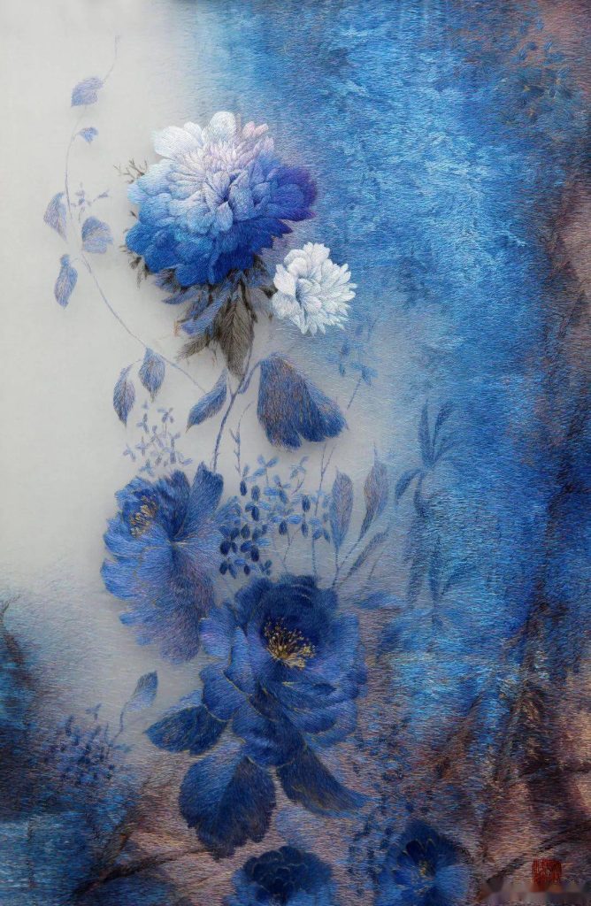 The soft, pale petals look weightless, swaying gently in the breeze and releasing a subtle fragrance. The embroidery blends so seamlessly that one could hardly distinguish it from an oil painting.